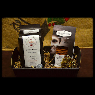 Box met 2 soorten koffie, en 1 doosje speculoos van La Confiance.
